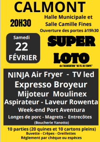 - 20h30 (ouverture des portes à 19h30) : SUPER LOTO- Asso. Au Fil du Temps. Halle et salle Camille FINES.