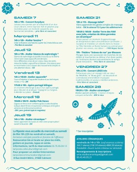 Sam.7 : - 10h30-16h30 : atelier céramique "Terre des Fam" (110€ la journée, repas veggie inclus). Café culturel La Riposte