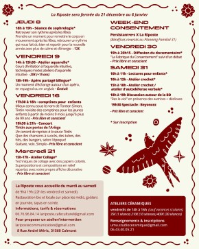 - 10h30-12h : atelier céramique parent-enfant. Café Culturel "La Riposte". 60€ le duo