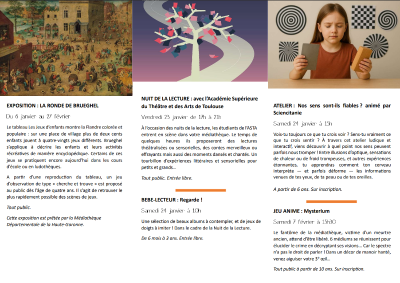- 15h : atelier "nos sens sont-ils fiables ?" animé par Sciencitanie. Médiathèque. A partir de 6 ans. Sur inscription.