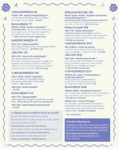 Ven.6 : - 17h30-19h : apéro partagé bilingue. Café Culturel La Riposte.