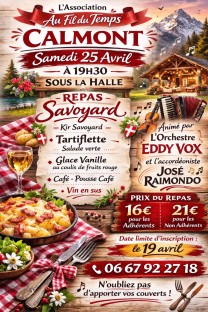 - 19h30 : Repas Savoyard et dansant- Asso. Au Fil du Temps. 16€ adhérents/21€ non adhérents. Sur inscription.