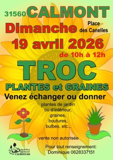 Dim.19 : 10h-12h : - Troc Plantes et Graines- Asso.Sentiers Nature Calmontais. Place des Canelles. Gratuit (pas de vente, échanges ou dons uniquement)